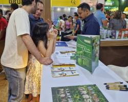 A assessora de Turismo da Prefeitura de Juína, Thaís Bergamin, destacou o potencial turístico e cultural de Juína, que esteve representada no estande.